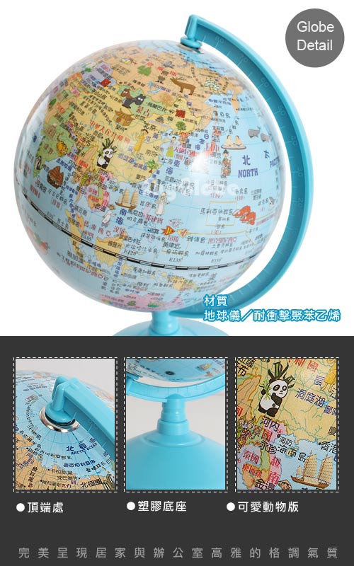 8吋地球儀則為傳統海洋平面,價格經濟實惠且大方,也比較不易被家中幼童毀壞。如果覺得字體太小,可考慮12吋塑膠底座地球儀,具中英對照,且字體夠大。