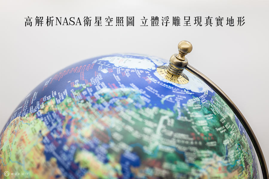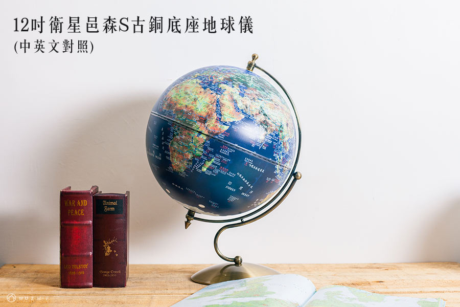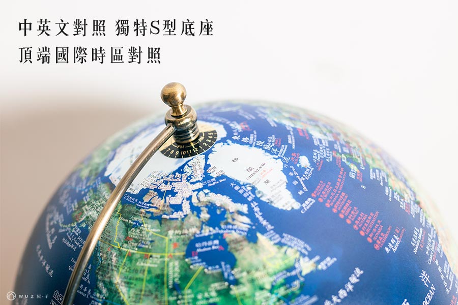 12吋球體地球儀兼具中英對照,字體大而顯眼,城市眾多,讓您找到想找的地方,當然也有分「衛星」及「仿古」2種,皆為「立體浮雕」及「三段式觸控點燈」,館長個人比較偏好仿古地球儀,質感較佳,但若是教育用途,衛星地球儀還是最多人的選擇。